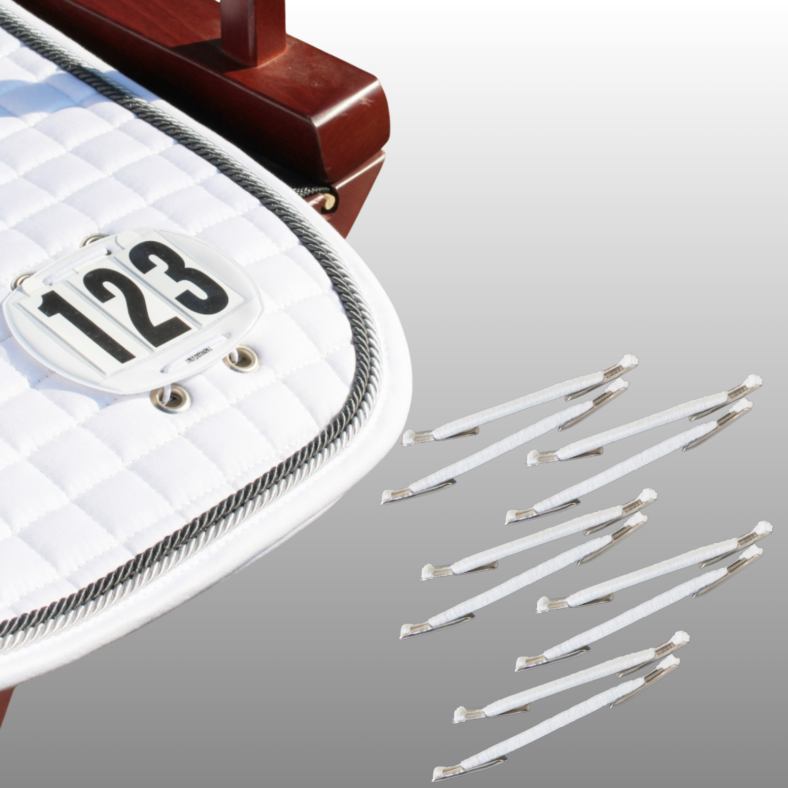Le kit de rechange pour élastiques EQUEST contient 10 élastiques robustes permettant de fixer solidement les numéros de départ sur les tapis de selle ou les brides. Idéal pour une utilisation professionnelle lors des compétitions et événements équestres.