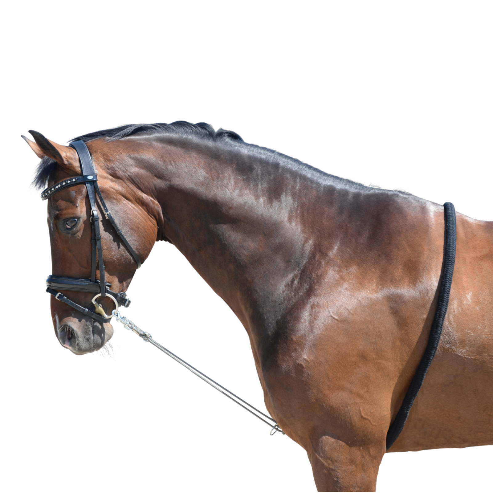 Die Soft Touch Longierhilfe unterstützt die Vorwärts-Abwärts-Bewegung des Pferdes bei der Arbeit an der Longe und fördert den Aufbau der Rücken- und Halsmuskulatur. Sie besteht aus einer Polypropylen-Kordel, die mit sehr weichem Soft Touch Material umhüllt ist, sodass keine Scheuerstellen am Rücken entstehen. Die beiden Kordelenden lassen sich stufenlos verstellen und können durch einen bzw. zwei Ringe am Gebiss fixiert werden.