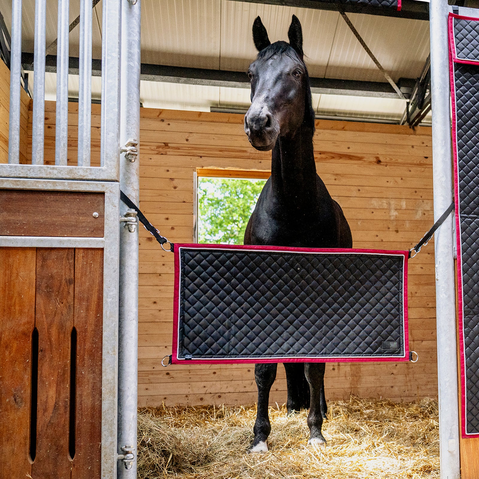 Der Stallguard aus sehr strapazierfähigem PVC Steppmaterial eignet sich ideal für den Einsatz in Boxentüren. Durch die größenverstellbaren Gurtstrippen an jeder Seite kann er optimal an die Stalltür angepasst werden. Die Front kann individuell veredelt werden.